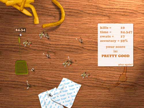 Flyswatter (klik het plaatje om te spelen) In het Nederlands: Mep de Vliegen. Dit is zo'n klein online spelletje dat Hildo op het internet zag staan. Klik op het plaatje en het spel kan al gespeeld. Het is de bedoeling dat u 10 virtuele vliegen met uw virtuele vliegenmepper platslaat in een zo kort mogelijke tijd. Wel de mepper na het spelen weer op het haakje hangen. Enne... Hildo kan het met 17 meppen in 24,34 seconden, u ook?