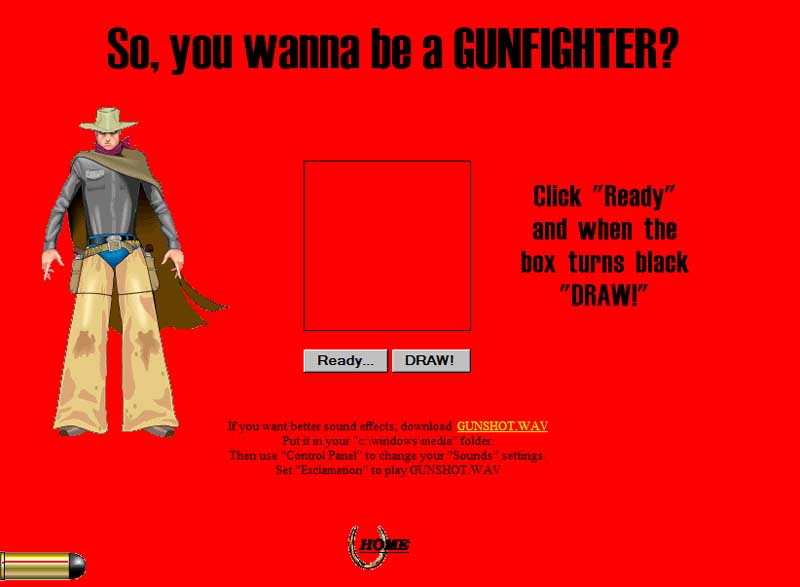 Gunfighter (klik het plaatje om te spelen) Het gaat er om een zo snel mogelijke tijd te behalen. U klikt op 'ready' en dan gaat u met uw muis boven 'draw' staan. Op het moment dat het vierkantje zwart wordt klikt u op 'draw'. Hildo is de jongste cowboy niet meer en blijft regelmatig op 0.265 en 0.266 seconden zitten als ie echt zijn best doet. Als u vals wilt spelen drukt u alvast op 'draw' en laat de muisknop alleen maar los als het vierkantje zwart wordt. Dat scheelt tijd. Hildo komt dan op bijna 0.20 seconden! Succes, en niet met uw ogen knipperen!!