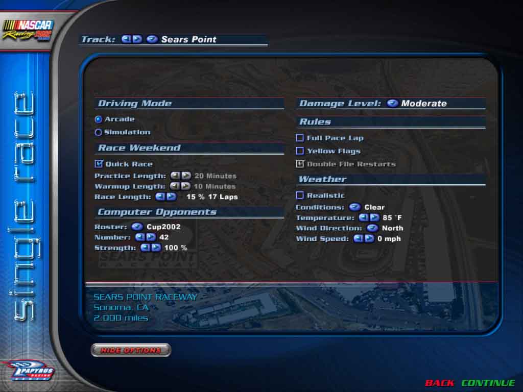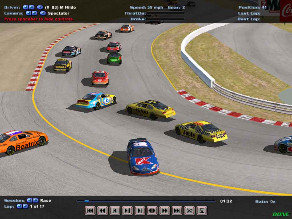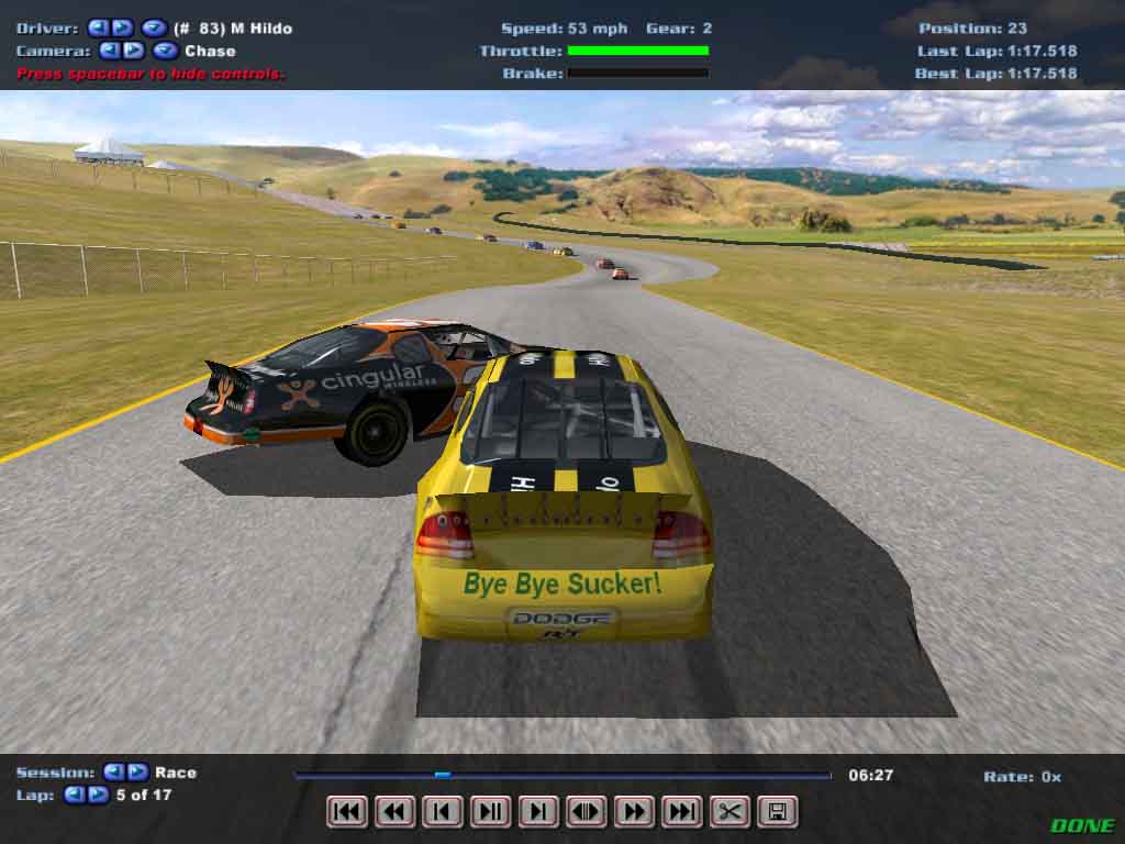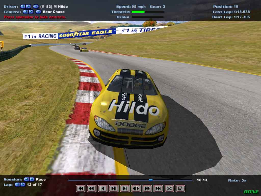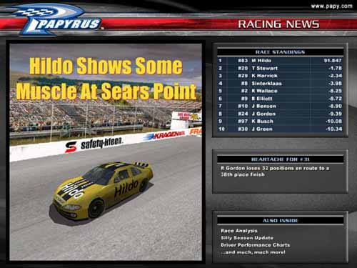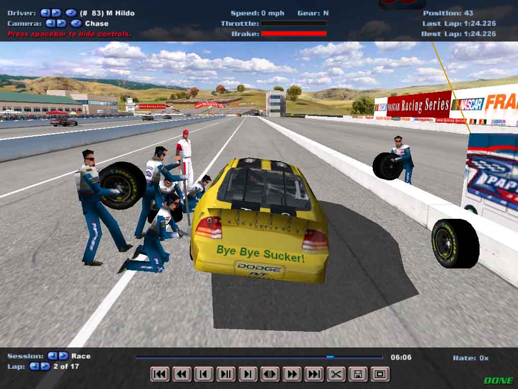 Nascar 2002 Hildo's all time favoriet! Het spel is Nascar Racing 2002, welke Hildo in 2006 heeft aangeschaft voor 7.50 Euro. Prikkie! Het mooiste racespel tot nu toe dat Hildo gespeeld heeft omdat de auto's in Nascar het meest reageren als een echte en bovendien ziet het spel er grafisch gelikt uit, zelfs al in 2002. Hildo's computer, een AMD Athlon 2000+ met simpele videokaart heeft er geen enkel probleem mee. Hiervóór heeft Hildo al jaren gereden met de voorloper: Nascar 2000. Je wordt er niet snel flauw van. Wat is Nascar? Nascar is een typische Amerikaanse sport waarbij met auto's van zo'n 700pk rondjes worden gereden op een ovale geasfalteerde baan, en dat met veel auto's tegelijk, tot zo'n 43 stuks. Tamelijk saai vindt men in Europa. Het lijkt wel wat op file rijden met 300 kmh. Krijgt u een tikje van een andere auto, u vliegt van de baan voordat u er erg in heeft. Geen andere auto's raken dus. Gelukkig zijn er behalve de wat saaie, min of meer ovale, typische Nascar banen ook twee racebanen, Sears Point en Watkins Glen, waar u zowel linker als rechter bochten tegenkomt. Die genieten dan ook Hildo's voorkeur. Hoe rijdt Hildo Nascar? Een beetje vreemd misschien... U kunt een kampioenschap rijden. Boeit Hildo niet. Auto afstellen, laat maar. U kunt kiezen uit misschien wel 30 banen, Hildo rijdt altijd op de twee zelfde. Nooit een volledig race maar een rondje of 17. Dat is zo'n 20 minuten racen en dat vindt Hildo genoeg, het moet ontspanning blijven. Hildo rijdt nooit de kwalificatie maar begint achteraan. Dan is het een kwestie van de race uitrijden en daarbij zo hoog mogelijk eindigen. U kunt de snelheid van de tegenstanders instellen van 70% tot 120%. Steeds weer hetzelfde rondje en u wordt vanzelf expert, dat betekent dat u uw medecoureurs steeds een procentje sneller instelt tot u ze nog net bij kunt houden en zelfs af en toe voorbij kunt rijden. Dat is het leukst en biedt de meeste uitdaging. En dan maar hopen dat u het tot de finish redt. Een topspel hoor!