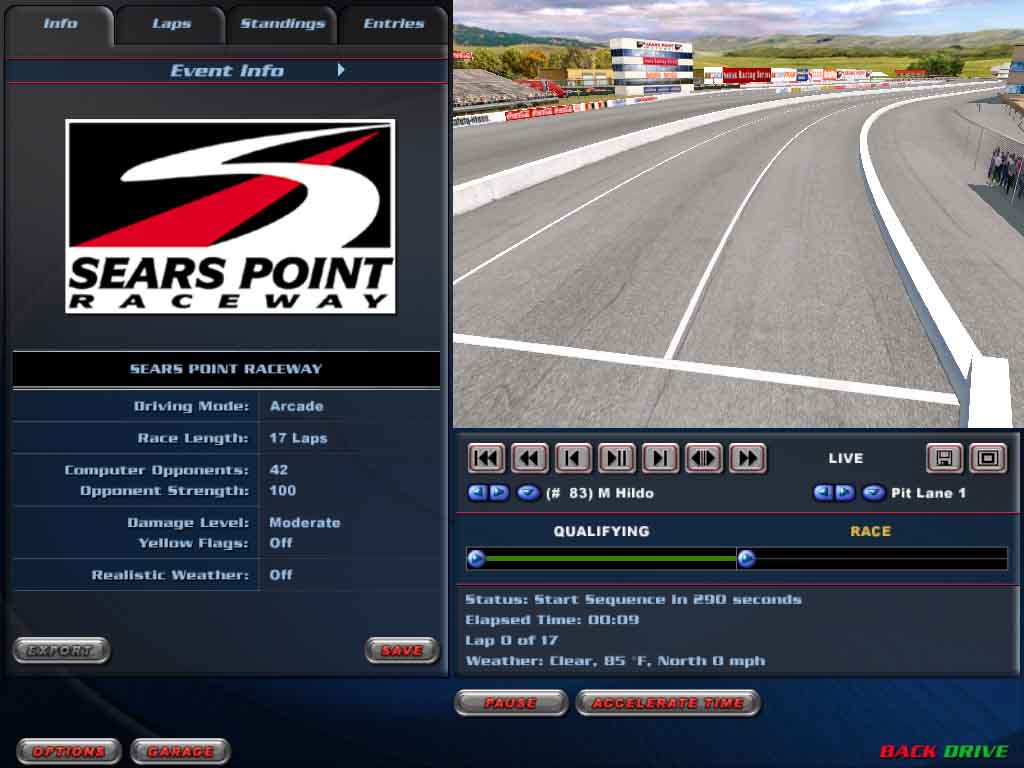 Scherm 2 Hier kiest u de baan, het aantal tegenstanders, de sterkte van uw medecoureurs en u stelt het percentage van de race in. In dit geval 15% of 17 rondjes en dat betekent 20 minuten race plezier. 100 procent zijn maar liefst 112 rondjes en dus meer dan 2 uur racen. Da's vermoeiend hoor want, vergis u niet, u kunt nauwelijks met uw ogen knipperen of er gaat al iets fout. Concentratie is geboden. Meer dan 17 ronden en u krijgt ook nog met pitstops te maken want uw banden moeten vernieuwd, uw benzine bijgevuld en uw auto wordt gelijk uitgedeukt.