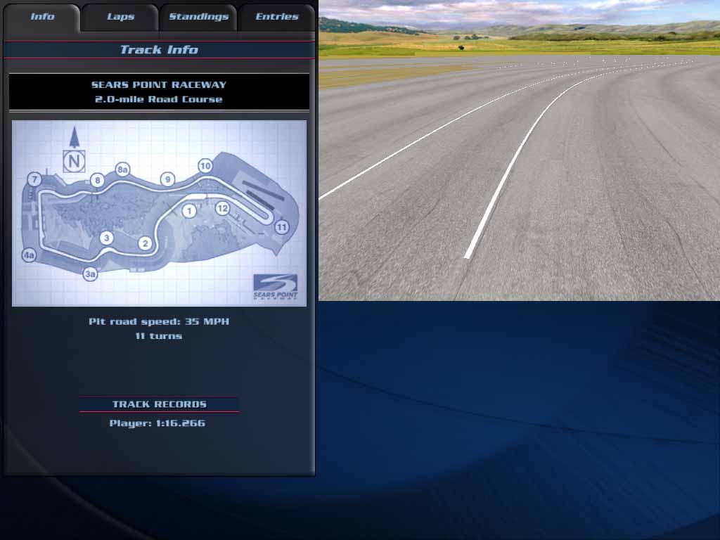 Sears Point. U ziet de plattegrond van de baan hierboven, Das toch heel wat anders dan een ovaaltje racen nietwaar? Hildo's ronderecord? U ziet hem hier staan op 1:16.266 seconden.