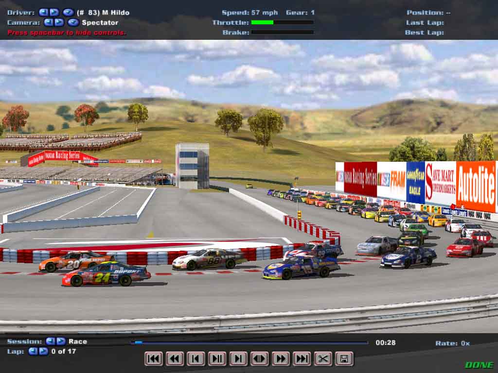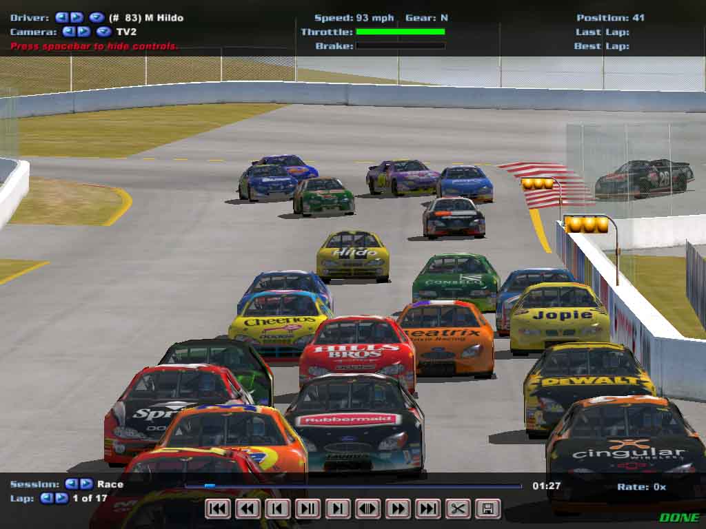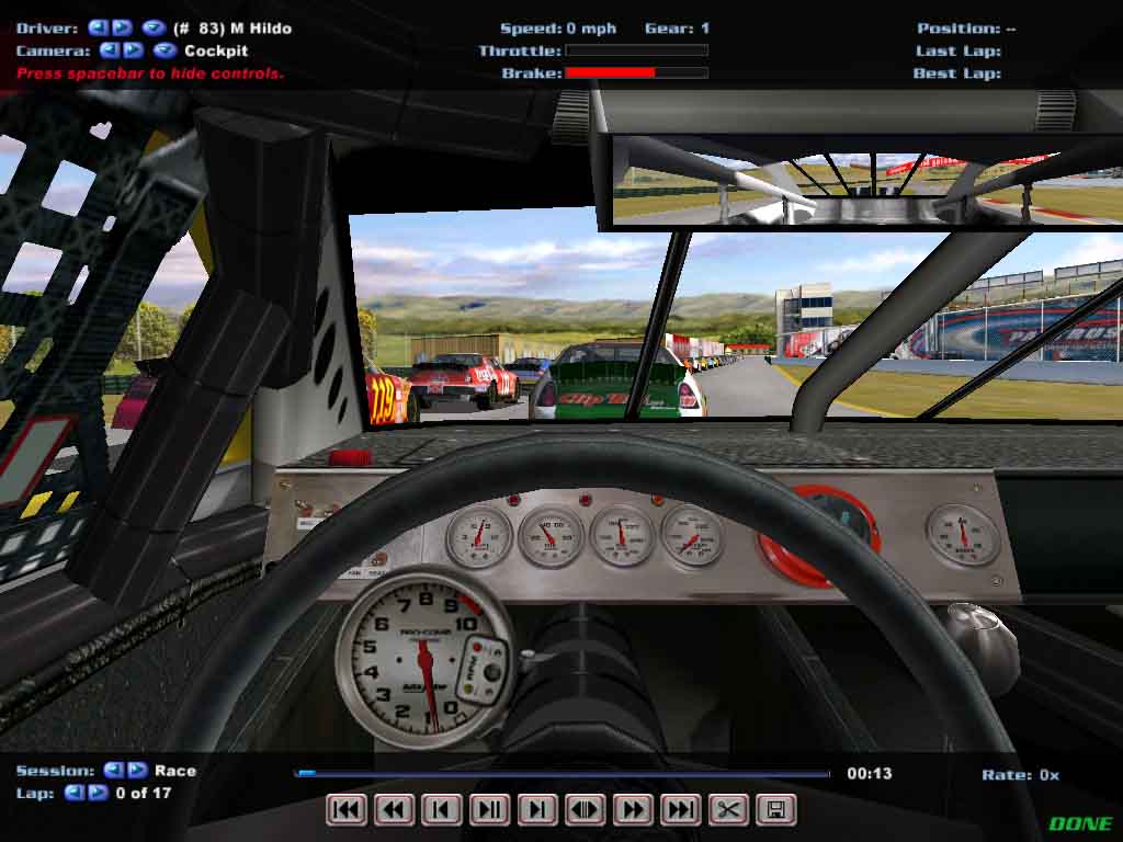 4) De start (klik foto groter) Hildo rijdt altijd met deze 'cockpit view'. Niet het beste overzicht maar wel de meest realistische. De knoppen onderin beeld ziet u alleen tijdens het terugspelen van de race die u gereden heeft. Een goed verlopen race kunt u zelfs opslaan om uw zoon van 13 te bewijzen dat u echt sneller bent dan hij! Bovendien is het gewoon erg leuk, en leerzaam, om uzelf te zien racen. U kunt kiezen uit verschillende camerastandpunten waaronder deze maar ook camera 1, camera 2, vooruitkijkend met zicht op de auto, vanaf het dak/motorklep, achteruitkijkend met zicht op de auto, achteruitkijkend vanaf de kofferbak, publieksview, helikopter view, links of rechts vanuit de auto. U begrijpt het al; camerastandpunten te over.