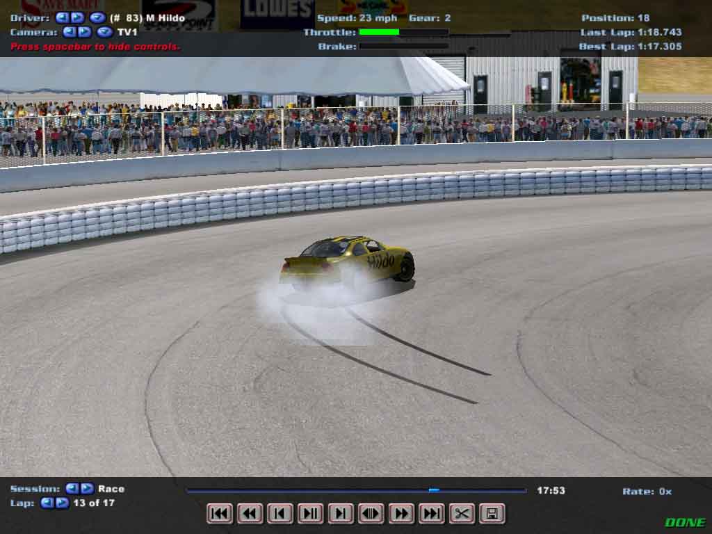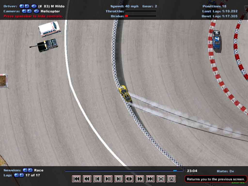 11) Helikopter view. Hier ziet u dat Hildo deze bocht verkeerd inschat en het gaat goed verkeerd. Evengoed behoudt Hildo z'n 18e positie. Goed resultaat voor Hildo, want hij heeft toch maar even ruim 20 auto's ingehaald tijdens deze race. Gefeliciteerd hoor! Dank u, dank u.