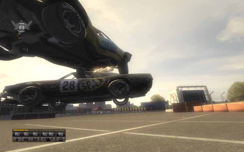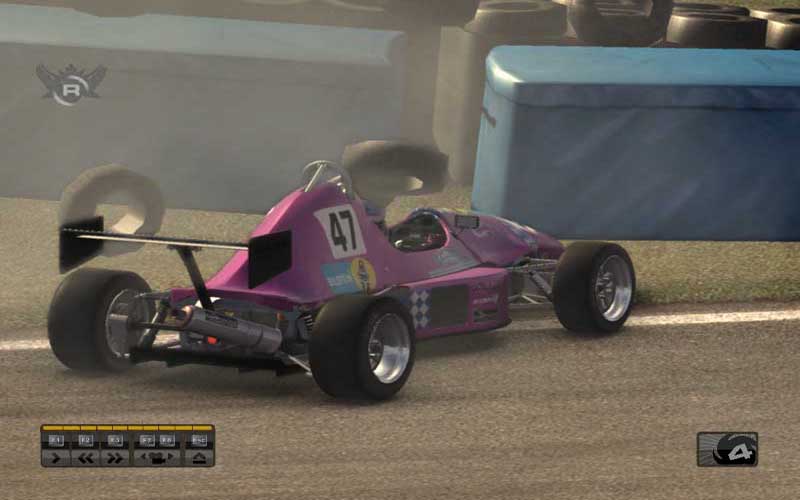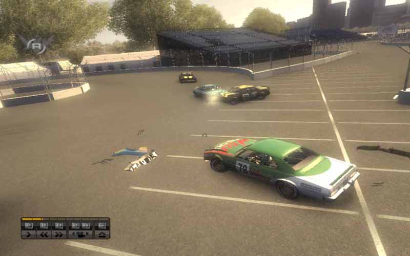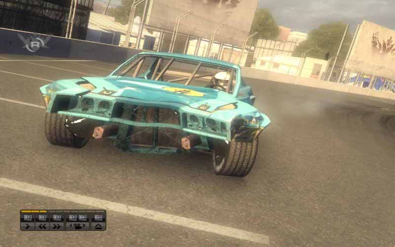 Er zijn verschillende races te rijden. Dit is de Demolition Derby, u ziet hier de start met Hildo in de blauwe wagen. Uw eigen kleurschema's blijven beperkt tot hapklare brokken. Klik, klik, klik, en u heeft uw eigen team kleuren. Echt zelf iets maken, dikke vette letters 'Hildo' op de motorkap? Dat kan niet. Jammer.