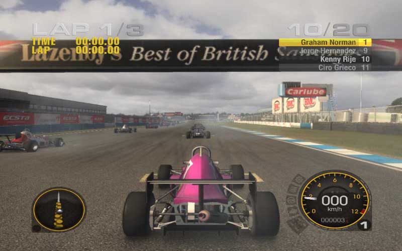 Dit is wat u ziet als u rijdt. Boven in beeld in welke ronde u zit, rondetijden en welke plaats u bezet. Onder in beeld rechts, de snelheidsmeter en links ziet u gele stipjes op een streep. De streep is de weg, handig om van te voren te zien of er een bocht aankomt als u het circuit niet goed kent. De gele stipjes zijn uw tegenstanders.