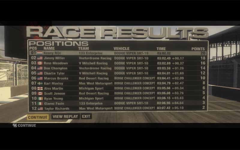De race met de Viper ging prima, u ziet hierboven dat Kenny Rije, dat is Hildo, bovenaan staat. Dit scherm krijgt u na elke race te zien. Jammer dat de makers van Grid vergeten zijn om er bij te zetten om welke race het ging.