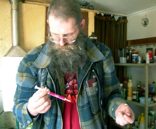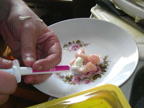 Eindelijk het spuitje open en op wat vlees. Het maakt mij allemaal niet uit want het vlees smakt zowel met als zonder anti-worm kuur even goed hoor!
