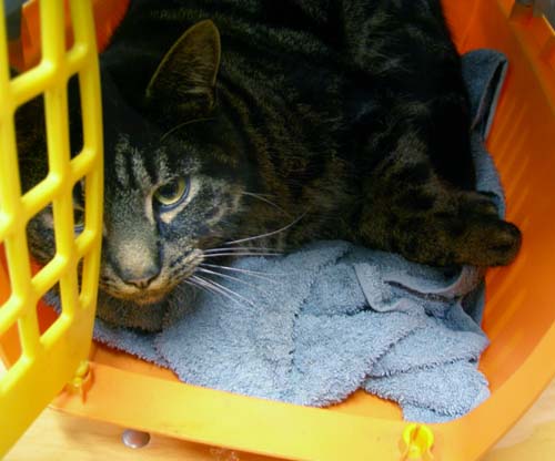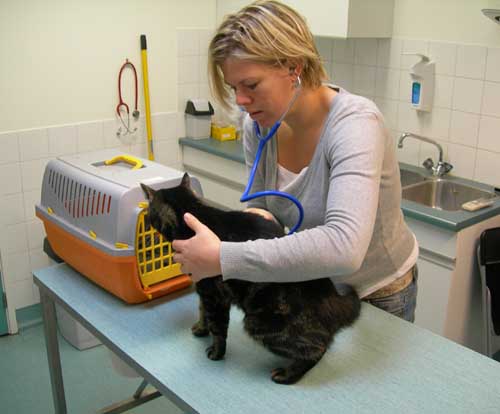 3 november 2007. Ik liep een beetje kreupel met mijn rechter voorpootje. Mijn Hildo vond dat ik naar de dierenarts moest. Ik niet, want in auto's rijden, daar heb ik een hekel aan gekregen. Gelukkig zong Mijn Hildo de hele weg liedjes voor mij en dat was wel prettig. Had last van mijn schouder en het deed wel een beetje zeer toen die dierenarts erop drukte. "Wat is er gebeurd dan?', vroeg Mijn Hildo mij. Ha, ha, hij moet beter weten. Hij vraagt mij aldoor waar ik geweest ben, wat ik gedaan heb, wat er gebeurd is. Hallo zeg! Zie ik eruit als een vraagbaak? Ik kreeg een injectie tegen ontstekingen, gecombineerd met een pijnstiller. Dat hielp wel. Mijn Hildo kreeg een potje met vloeistof mee naar huis die hij in mijn keel moest gieten. Dat is helemaal niet nodig want ik lust dat spul ook zo wel, ontstekingsremmers zijn best lekker hoor en ze kosten maar 70 Euro. Dat is helemaal niet duur, vind ik.