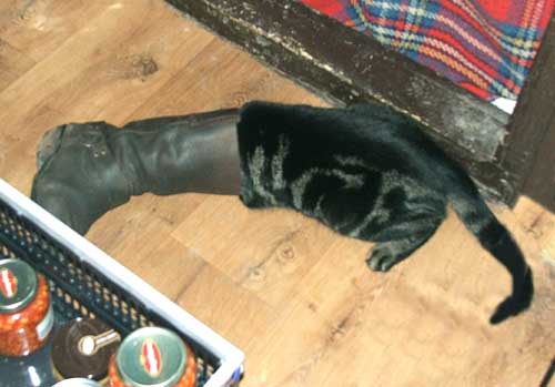 Hier heeft Mijn Hildo z'n laars plat op de grond gelegd. Rent die muis die laars in natuurlijk. Stom, stom! En ik krijg hem er niet meer uit ook. Ik weet wel wat er aan de hand is, Mijn Hildo wil 'm gewoon voor zichzelf hebben! En dan later met die laars naar buiten, als ik het niet zie, en die muis helemaal zelf opeten. Hij flikt het me ook elke keer weer. Mijn Hildo is een dikke Egoïst! Maar goed, ik vergeef het hem, hij kan er ook niets aan doen dat ie niet meer verstand heeft. Ik leg ook wel muisjes bij mijn buurvrouw op de stoep, mag ze die opeten. Ik ben hartstikke sociaal, maar dat kun je van sommige mensen niet zeggen.