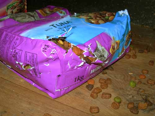 Soms zijn mijn brokjes een beetje slof. Als je de keus hebt tussen wat kleffe of verse brokjes dan is de keus snel gemaakt! Als mijn Hildo niet snel genoeg is met het bijvullen van mijn bakje dan regel ik dat zelf wel. 'Wat heb je nou weer gedaan Bijtie?' vraagt dompie dan ook nog. Zelfbediening natuurlijk!