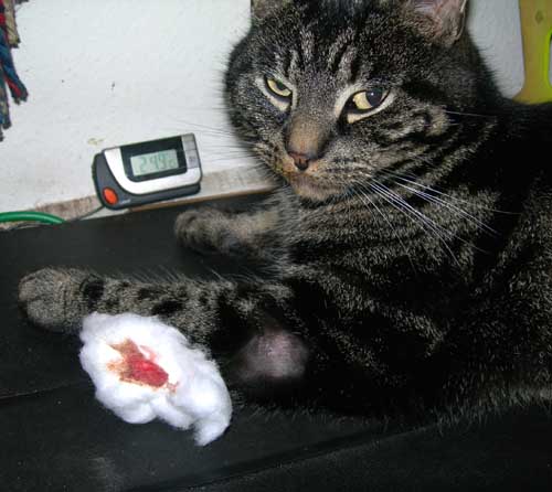 15 februari 2008. Operatie Het leven van een kat gaat niet over rozen, zeker niet als je door een ander kat in je poot gebeten bent. Het gaatje in mijn poot van 28 januari staat in geen verhouding tot de bult met allemaal pus eronder die zich daarna vormde. Voor mijn Hildo was de maat vol, 'Dit komt niet goed, Bijtie', en ik moest weer mee naar de dierenarts. Bij de dierenarts kreeg ik weer een prik om de pus er uit te halen en ik moest gelijk blijven voor een... operatie! 'Dat leggen we even goed open' klonk me niet goed in de oren, maar wat gebeuren moet, dat moet.