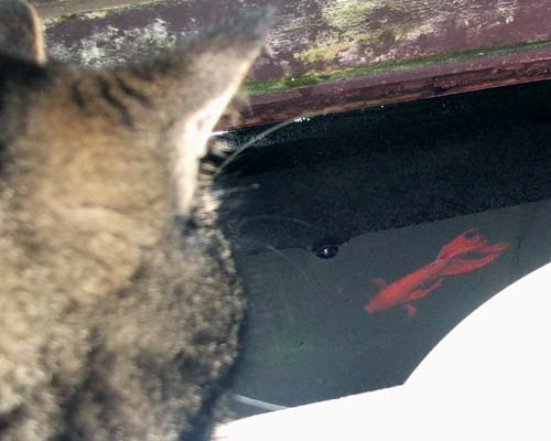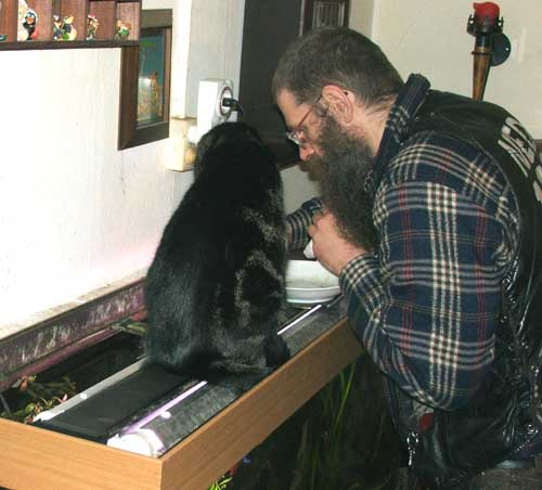 Zit ik net op mijn favoriet plekje, moet mijn Hildo er weer bij. Vervelend hoor. Voordat mijn Hildo het in de gaten heeft: Hup!, en ik spring zo van de grond op het aquarium. Ik land daarbij nooit in het water ondanks het feit dat ik van te voren niet kan zien waar de lichtbak ligt. Soms land ik zelfs met mijn achterpoten alleen maar op de rand van de houten omlijsting. Mijn Hildo wil het eigenlijk niet hebben omdat hij bang is dat ik in het aquarium val. Ha, ha, dat gebeurt natuurlijk niet! Ik ben gewoon een Super Kat met een motorieke controle en reactiesnelheid waar mijn Hildo een puntje aan kan zuigen. Dat het niet mag boeit mij niet, het is veel te interessant om te zien wat mijn Hildo aan het doen is en ik volg elke beweging gebiologeerd.