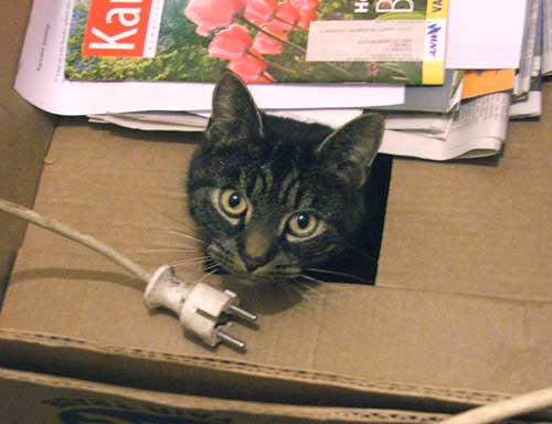 Kijk, daar zit ie. Als Mijn Hildo een greintje fatsoen had, zou hij die muis er gewoon even voor mij uitschudden, kan ik verder spelen. Maar nee hoor, hij heeft niets voor mij over!