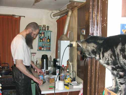Wel een blikje voor mij dus. Er is altijd één probleem, en dat is mijn Hildo. Hij is zo vre-se-lijk traaaag....en staat daar maar wat te staan. Toe dan slome duikelaar, hoe moeilijk kan het zijn om wat voer uit het blikje in een bordje te kieperen? Tjonge...