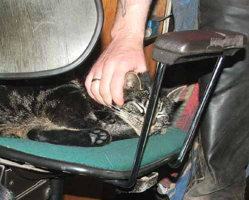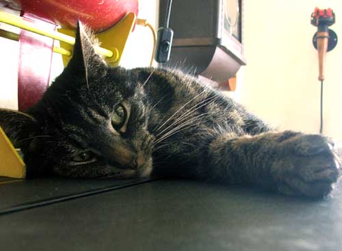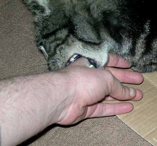 Mijn Hildo commandeert af en toe nogal wat. ´Ga van die stoel af, ik wil er zitten´, ´Niet op het aquarium want ik moet met de visjes aan de gang´, en ga zo maar door. Dat ik mij niet laat commanderen mag duidelijk zijn. Ik speel altijd De Verlamde Kat als Hildo iets van mij wil. Mijn lijfje en alle pootjes worden plotsklaps slap en als mijn Hildo mij ergens heen wil hebben dan moet ie het zelf maar doen.