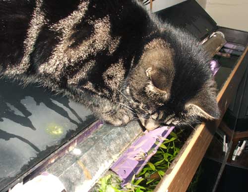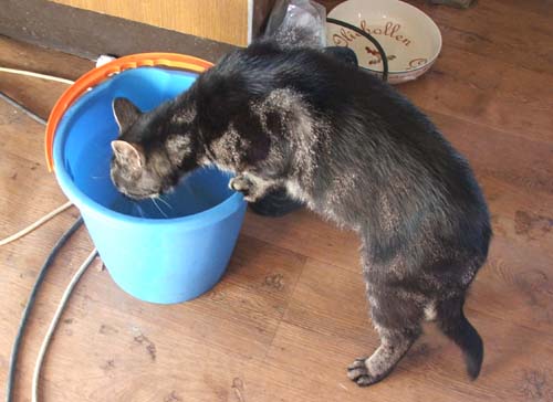15 juni 2009 Het aquariumwater wordt ververst. Paar emmertjes oud water eruit, paar emmertjes met nieuw water erin. Even inspecteren dat oude aquariumwater... Ruikt wel lekker, iets van visaroma, en het smaakt ook goed! Mijn Hildo heeft mij nog nooit zoveel zien drinken in één keer. Mijn 'Oliebollen' kommetje is altijd met met vers water gevuld en het is het enige waar ik binnenhuis uit drinken wil. Buitenwater drink ik natuurlijk wel, met name als het er lekker vies uitziet. Maar niets haalt het bij dit aquariumwater. Slubber, slubber, lekker zeg!
