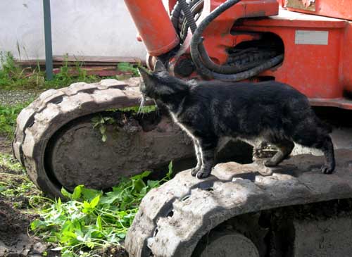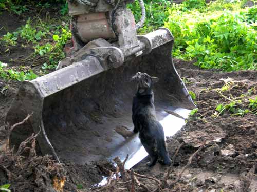 23 mei 2009 Mijn Hildo heeft een kraanmachinist laten komen op de gigantische zooi in zijn tuin op te ruimen. Als de man even pauze heeft, zie ik mijn kans schoon. Er in, er op, er onder en alles inspecteren. Alle voertuigen, motoren, auto's, kranen zijn bijzonder interessant. Ik kan niet wachten om erin te kruipen.