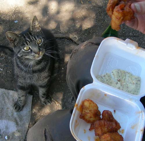 30 mei 2009 Ik weet wel wat Mijn Hildo daar eet. Kibbeling! Ik weet ook dat ik er niet aan moet komen, in ieder geval niet als mijn Hildo het op schoot heeft, want dan is het niet te best. Het is uitermate vervelend dat hij altijd eerst gaat zitten smikkelen, en mij alleen maar laat toekijken. Het laatste stukje, wat hij even schoon maakt onder de kraan om het te ontdoen van zout en kruiden, mag ik altijd hebben. Ahhh... en dat is lekker! Mijn Hildo eet alleen zóóó langzaam.