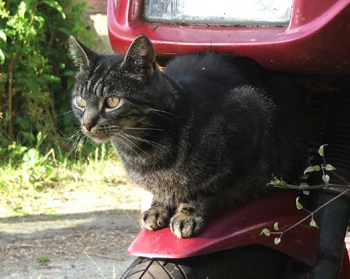 18 juni 2009 Ik speel spatbord-ornament op Mijn Hildo's BMW! Ik zit precies recht en kijk zo stoïcijns mogelijk, net zoals ornamenten dat doen. In auto's zitten is natuurlijk leuker, maar een motorfiets gaat ook nog wel. Deze BMW is okay, maar Mijn Hildo's Harley is een onding. Zodra hij z'n voet op de kickstarter zet, dan wandel ik weg want ik weet drommels goed wat er dan komt. Het harde knetterende geluid van Mijn Hildo's 125cc Skyteam Dax, dat maakt mij weinig uit. Met cirkelzagen die door hout gaan heb ik overigens ook geen probleem, zelfs als Mijn Hildo zit te cirkelzagen in de woonkamer blijf ik gewoon liggen. Hij zelf is minder cool, want hij heeft oordoppen op... Ziet er niet uit!