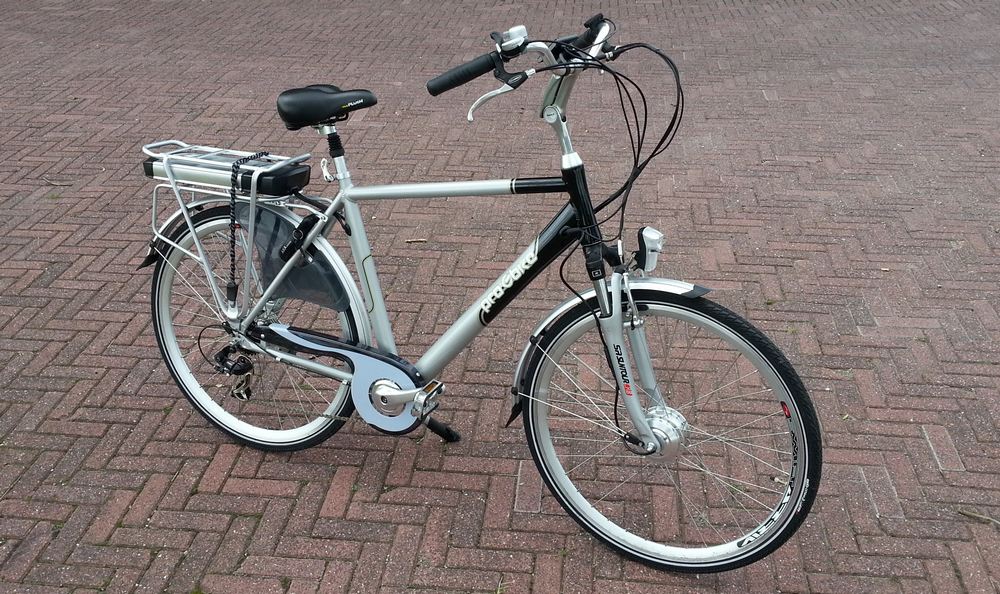 1 augustus 2015. Hoe rijdt ie dan? Lekker! Tenminste, voor zover Hildo het tijdens deze 50 kilometer-rit kan beoordelen als fietser met nauwelijks ervaring. Volledig rammel-, piep- en kraakvrij en met vering in de voorvork en zadelpen. Het rijdt mooi solide en hij vindt het niet zwaar trappen. Zonder trapondersteuning trapt deze fiets volgens Hildo misschien nog wel lichter dan zijn oude 75 euro Gazelle fiets. De negen standen voor trapondersteuning helpen hem een bepaalde minimumsnelheid te houden. Stand 9, de snelste, valt bij 25 km/h uit, maar stand 4 bijvoorbeeld al bij iets van 16 km/h. U kunt dus gewoon fietsen en de motor heeft geen of slechts weinig stroom nodig om deze snelheid aan te houden, afhankelijk van hoeveel energie aan spierkracht u zelf levert. Verliest u wat snelheid door wind of een heuveltje, dan begint de motor automatisch een beetje mee te werken. Verliest u nog meer snelheid, dan gaat de motor steeds sterker meewerken om die 16 km/h van stand 4 aan te houden, het werkt als een soort van cruise control. Om een hogere 25 km/h aan te houden van stand 9 is er meer energie nodig en u ziet het stroomverbruik op het display omhoog schieten. Eerst vond Hildo het een vreemd werkend systeem, maar in de praktijk blijkt het erg goed te voldoen. Als Hildo niet te snel rijdt, zijn eigen 'gemakkelijk aan te houden cruise snelheid', wat in de praktijk zonder wind op dit moment rond de 12 km/h zal liggen, dan gebruikt de fiets erg weinig tot geen stroom. Hoe sneller hij rijdt, hoe meer energieverbruik, logisch. De zitpositie is verder prima en zonder gereedschap in te stellen. |