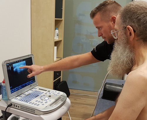 28 november 2017. Injectie tegen slijmbeursontsteking Ondanks oefenen gaat het niet beter met de slijmbeursontsteking, zelfs slechter met de rechterarm, de linker is ongeveer gelijk gebleven. Slapen is dramatisch geworden. Halverwege de nacht wordt de pijn te ernstig en wil slapen helemaal niet meer. Eerst tot 1-2 uur van bed af om de schouders weer een beetje te laten bijkomen alvorens er verder geslapen kan worden. Gisteren heeft Hildo zich ziek gemeld want ook computerwerk belast de schouder duidelijk. Hildo krijgt met oefeningen de ontsteking niet onder controle, het wordt alleen erger. Ook niet oefenen is niet de juiste methode. Hij wil hij verder met de volgende stap. Een injectie met corticosteroïden bij SEDN te Groningen 'Tijdens de echo werd een vocht in de supraspinatuspees gezien die verdikt was en een lineair ruptuurtje (scheurtje) van 2mm mogelijk passen bij degeneratie'. Conclusie: bursitis subacromialis. Supraspinatuspees tendinose met (degeneratief) ruptuurtje. In de bursa subacromialis werd 20mg Lidocaïne (verdovingsmiddel) en 40mg Kenakort (ontstekingsremmer) geïnjecteerd. Ook vertelde de Physician Assistant, die de injectie gaf, dat er lichte slijtageverschijnselen aan de schouder te zien was. Of Hildo zwaar werk had gehad? Dat heeft ie, tot midden twintig. En nu? Afwachten of het werkt, eerst kan het even erger worden, tot de verbetering intreed. Hildo hoopt er het beste van. Uiteindelijk... Na een week blijkt dat de injectie helemaal niets heeft geholpen.