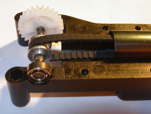Pulley bevestiging De belt is nu los genoeg te zetten. De pulley zelf en het witte aandrijftandwieltje zitten op een asje. Het asje zit zowel boven als onder in een rollenlager die in de tailboom mount komt te liggen. U ziet de aluminium staartbuis rechts op de foto. Door de beide helften van de tailboom mount weer tegen elkaar te leggen en in de achterkant van de helikopter te steken, zit de hele constructie op z'n plek. Door alles vast te draaien wordt de staartbuis shocking vast ingeklemd. Door de staartbuis iets naar voren of achteren te schuiven kunt u, voor het vastschroeven, de beltspanning afstellen. Leuk systeem. Wel er op letten dat de belt goed door de staartbuis heen loopt en op de goede manier om de pulley zit, anders draait de staartrotor de verkeerde kant op. Torque Tube Dezelfde heli als deze is ook in een 'Torque Tube' (TT) versie verkrijgbaar. Bij de TT heli wordt de aandrijving van de staartrotor niet door een belt verzorgd, maar door een soort cardan-asje, dat door een lagertje ongeveer halverwege de staartbuis ondersteund wordt. Erg mooi, maar tamelijk gevoelig voor onzachte landingen waarbij de plastic tandwielen gestript worden, naar wat Hildo er van begrepen heeft. Vandaar dat Hildo voor de beltdrive versie gegaan is.