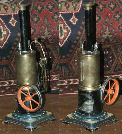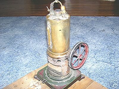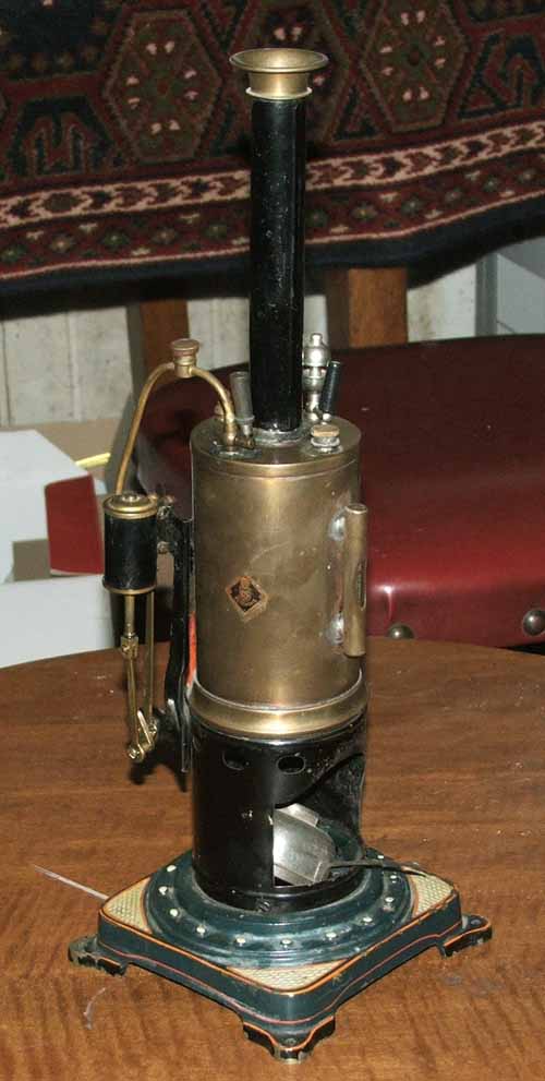 Bing uit 1910? De Duitse ebay is vaak een bron van vermaak voor Hildo's stoommachinelusten. Deze staande Märklin van rond 1910 werd aangeboden in Oostenrijk. Liefst 40 cm hoog inclusief schoorsteen. Een joekel want Hildo had nog nooit een staande machine van deze afmeting gezien, de meeste zijn rond de 30 cm. Dus zoeken op internet naar dergelijke Märklins. Even niet te vinden dus Hildo heeft deze Superspeciale Märklin machine gekocht voor een bodemprijs. Prikkie! Ha, ha, ha, juichte Hildo nog, geweldig! U weet dat Märklins zeer gewilde stoommachines zijn en dat het daarmee tot de duurdere Duitse merken behoort? De geïnteresseerde stoommachine-amateur zag hier natuurlijk direct doorheen, Hildo niet, en daarom heeft hij nu een Bing met een erop geplakt Märklin embleem. Achteraf blijkt deze, eveneens Duitse, Bing duidelijk te herkennen aan zijn karakteristieke voetstuk. Hmmm, bromt Hildo. Toch heeft hij ook bij deze Bing een goed gevoel want dit is een zeer oud model, waarschijnlijk inderdaad van rond 1910, en nog in uitstekende staat voor zijn leeftijd. Tevens is het een van de grootste staande Bings die ooit geproduceerd zijn, lijkt het. Hildo moet nog even zoeken naar wat hij nu precies aangeschaft heeft, want hij heeft dit model nog steeds niet kunnen traceren. Al heel wat Bing sites bekeken dus deze machine is volgens Hildo best tamelijk zeldzaam, en zeker in deze goede staat. De Bing lijkt dus niet verkeerd. Dus toch nog 'Joepie'!, aldus Hildo.