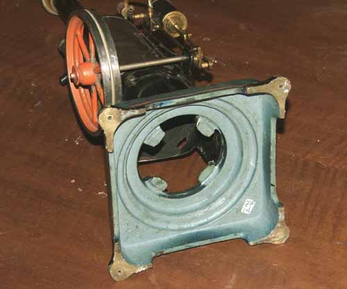 Aanzicht onderzijde van het in messing, of brons, gegoten voetstuk. Vanuit de onderzijde kunt in een keer helemaal naar boven kijken, dwars door de ketel en schoorsteen heen. De roet van het gebruik zit nog tegen de onderzijde van de ketel en schoorsteen. Deze rookt dus echt, tenminste als spiritus zou roken, maar dat doet het niet. Zou deze machine vroeger op petroleum gedraaid hebben? _________________________________________________