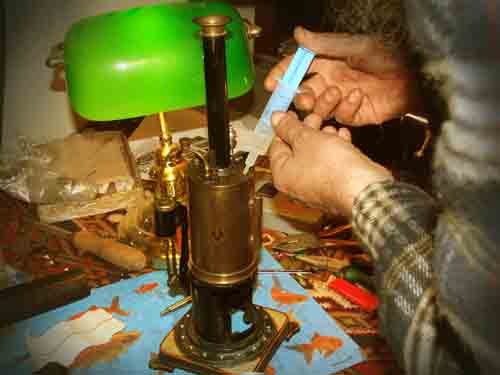 'Ach wat triest', weet Hildo nog uit te brengen met trillende onderlip. 'Het keteltje is lek'! Ook zonder stoomdruk sijpelt het water er al uit. De behuizing van het peilglas voor het waterniveau zit vastgesoldeerd aan de ketel, en die verbinding lekt. Het stomen gaat niet door en Hildo begint hier ook niet aan te knoeien. Hij heeft genoeg ellende beleefd met het solderen aan de gasleidingen van zijn kachel, dus dit werkje laat hij over aan een expert. Nu alleen nog even een antieke stoommachine soldeerexpert vinden natuurlijk. |