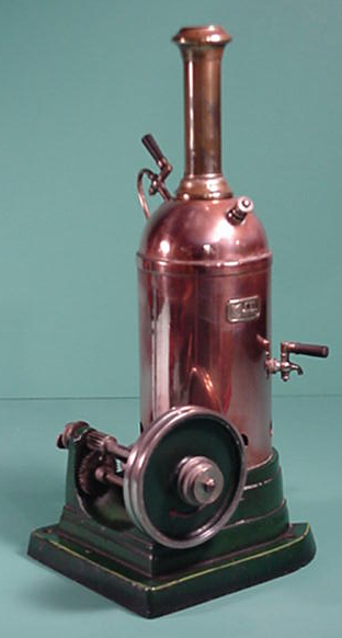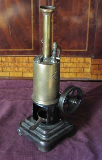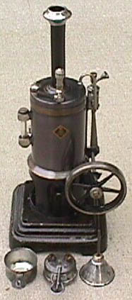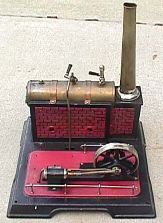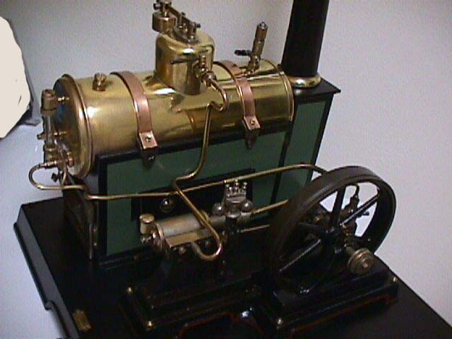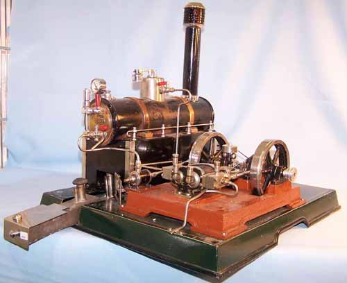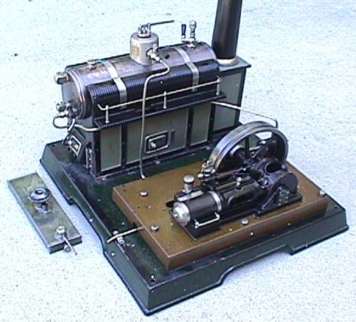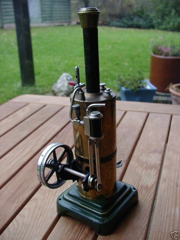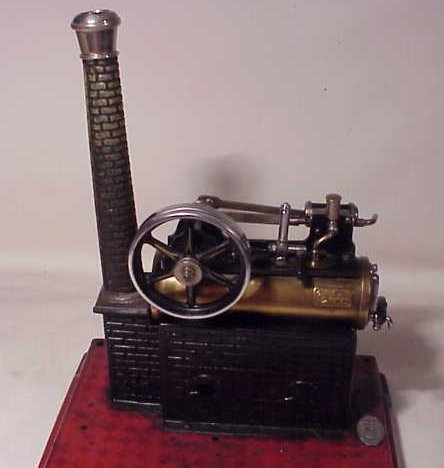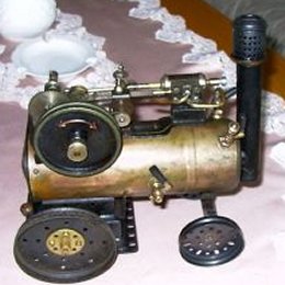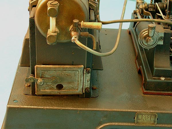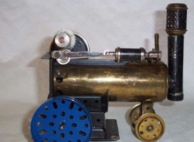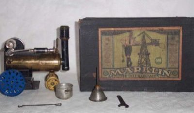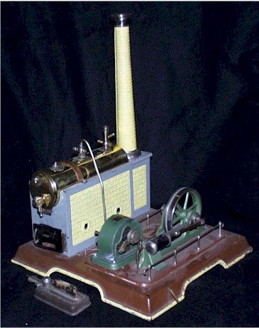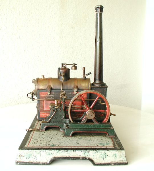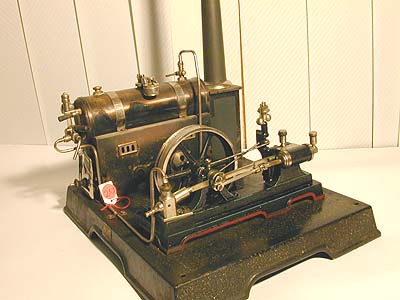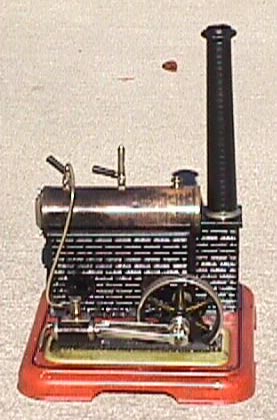 Märklin Overtype stoommachine Hildo weet niet welk type het hier betreft maar het schijnt uit 1920 te stammen, de kleinste Märklin te zijn en ze werden naar verluid slechts één jaar gemaakt.Een geavanceerd apparaatje, want het betreft hier een compound engine (een kleine en een grotere cilinder). Afmetingen: Voet 2 3/4"x 5", 4 1/2" hoog, 6 5/8" lang en de ketel 1 1/2" diameter and 5 1/2" lang. Vliegwiel 1 3/8" diameter. De schoorsteen mist.