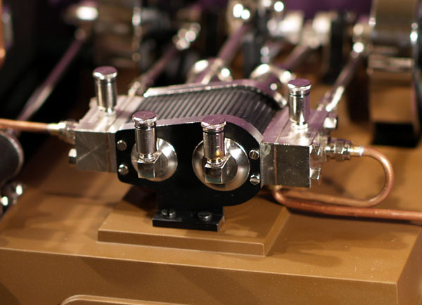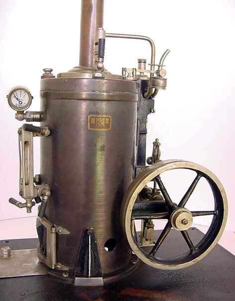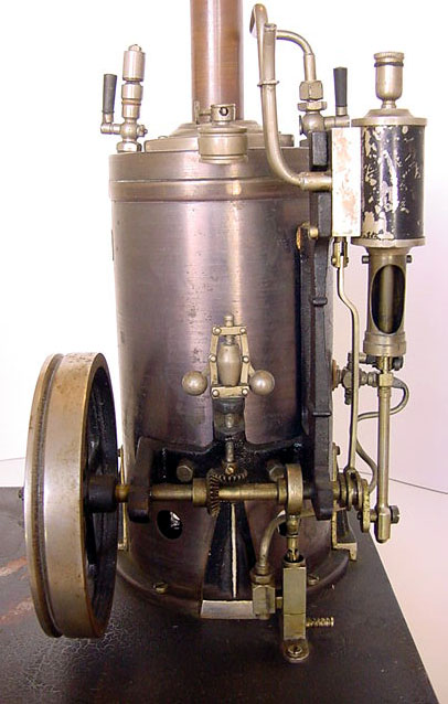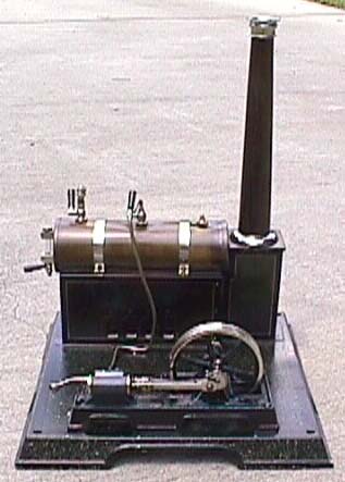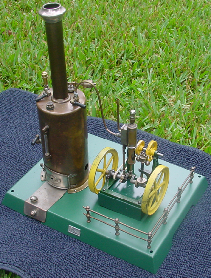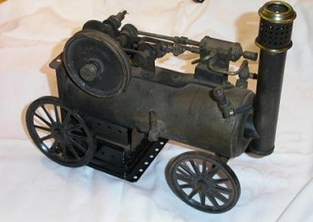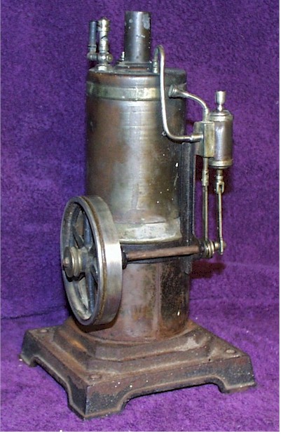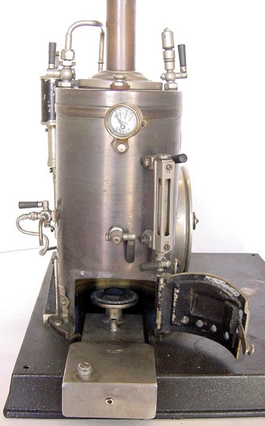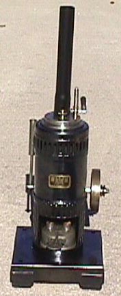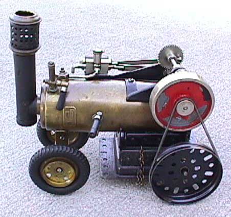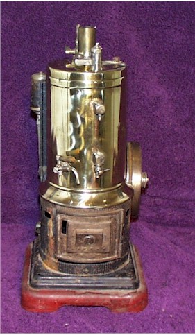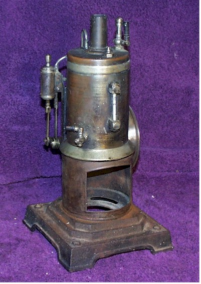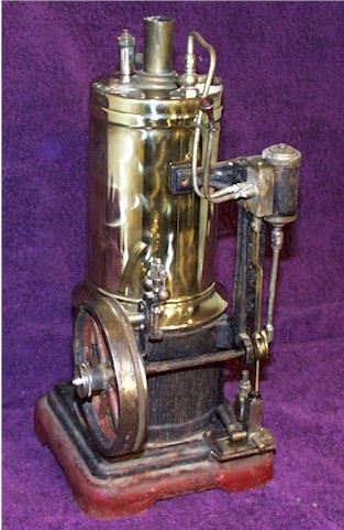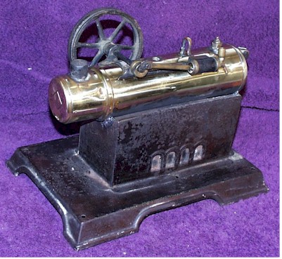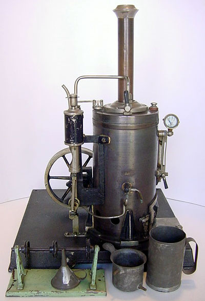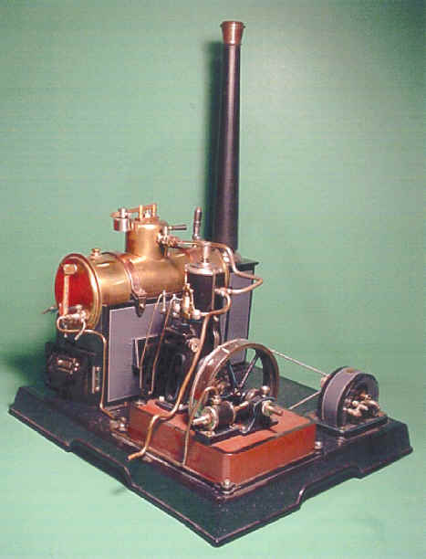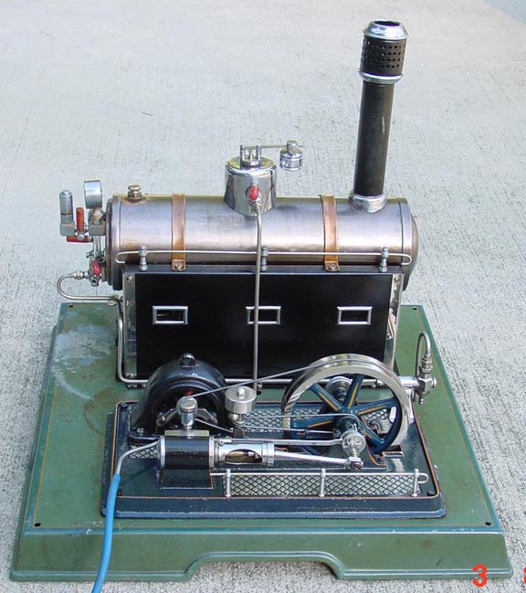 Märklin Overtype stoommachine Hildo weet niet welk type het hier betreft maar het schijnt uit 1920 te stammen, de kleinste Märklin te zijn en ze werden naar verluid slechts één jaar gemaakt.Een geavanceerd apparaatje, want het betreft hier een compound engine (een kleine en een grotere cilinder). Afmetingen: Voet 2 3/4"x 5", 4 1/2" hoog, 6 5/8" lang en de ketel 1 1/2" diameter and 5 1/2" lang. Vliegwiel 1 3/8" diameter. De schoorsteen mist.