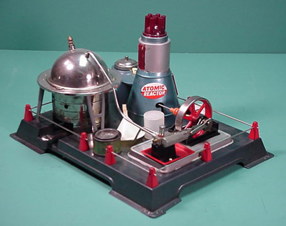 Linemar Atomic Plant. Rond 1950 Linemar was de Japanse tak van Marx Toys. Deze stoommachine speelt duidelijk in op een destijds 'hot item', atoom energie. In dit fabriekje zit een batterij die bewegende lampjes laat oplichten onder de 'atomic Reactor' als de machine draait. |