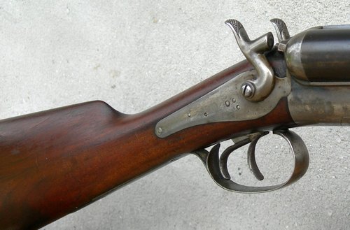 Engelse kolf De kolf is van geolied walnotenhout en verkeert nog steeds in goede staat zonder veel butsen of andere beschadigingen. De eigenaar van dit geweer is er netjes mee omgegaan en heeft er goed voor gezorgd. De term 'Engelse kolf' slaat op hoe de kolf eruit ziet, het is niet voorzien van een zogenaamde 'pistoolgrip' achter de trekkerbeugel, een uitstulping aan de onderkant van de kolf om de grip ergonomischer te maken. Het is en blijft persoonlijk, maar een Engelse kolf is natuurlijk slanker en Hildo vindt het mooier om te zien. Eleanor, Hildo's Rigby voorlaad replica, is voorzien van een pistoolgrip en dat ligt inderdaad goed in de hand en geeft een betere grip op het wapen, vooral als er nogal wat terugslag is. Dubbele trekker De voorste trekker is voor de rechter loop, de achterste voor de linker. Niet allebei tegelijk, dat wordt een beetje veel van het goede.