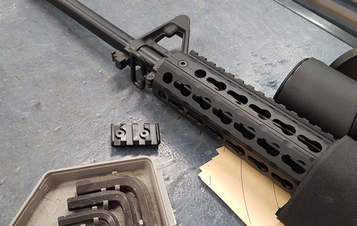 4 juli 2020. De UTG vervangende hand guard Deze is van aluminium en onderaan heeft Hildo alvast het stukje picatinny rail geschroefd waar straks de bi-pod aangeklikt kan worden. Die mogelijkheid was er bij de originele plastic hand guard niet. Er zit al een beetje loctite op de schroefjes en wat extra imitatie loctite, wat hij nog had staan van zijn RC helikopters, kan geen kwaad. Wapens rammelen los en verloren schroefjes zijn, in principe, te voorkomen.