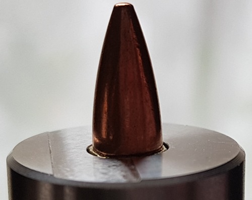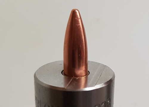 29 augustus 2020. 10 x 24.0 grain met maximale krimp Nog even een paar extra foto's van hoe de maximale krimp van de LEE Factory Crimp Die eruit ziet. De buitendiameter van 0.246" is de maat zoals de huls uit de LEE full length sizing die komt en... die buitenmaat blijft hetzelfde als de kogel er in geperst wordt. 'Dat is vreemd', denkt Hildo, 'zit ie er standaard vast niet superstrak in'. Als Hildo de buitendiameter van de krimprand zelf opmeet, is die 0.236". Het verschil is 0.01" ofwel een 100ste inch. Lijkt weinig, maar is visueel al best veel en de kogel is, niet goed zichtbaar op de foto, ook al duidelijk vervormd door de krimp. Hoe het schiet en of het van invloed is op hoe de primer eruit ziet, wordt binnenkort duidelijk want Hildo heeft ook nog 10x 24 grain zonder, krimp, 10x met krimp en 10x met maximale krimp, wat wil een mens nog meer? Hoort hij daar iemand 'precisie' zeggen? Dát is een steek onder de gordel!