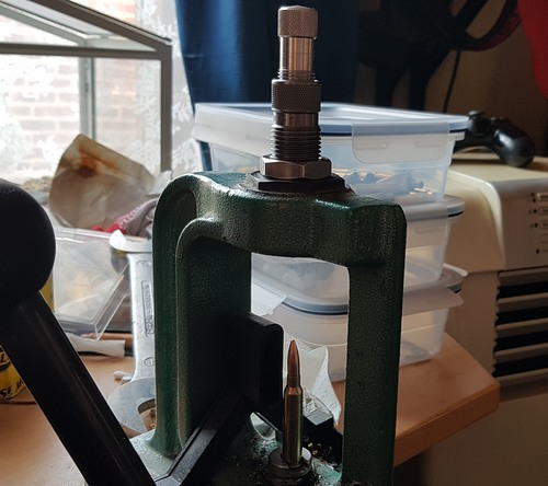 5 september 2020. Klem in de full length sizing die Alle hulzen full length sizen, en dat gaat allemaal goed op deze ene na waar net een beetje te weinig van Hildo's eigengemaakt hulzenvet op zit. Heel veel kracht hoeft er niet eens gezet te worden voordat de shelholder een stuk van de hulsextractierand aftrekt, het randje is maar klein en de huls is stuk voor u het weet. Met een waterpomptang voor de grip en een schroevendraaier voor hevelwerking was het even wrikken maar de huls had Hildo er vrij vlot uit.
