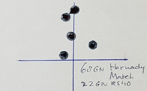 9 september 2020. Hildo 55 grain ammo Zelf herladen munitie met de 55 grain kogel en 24 grain Lovex S060. Er zijn nog meer kaarten, maar Hildo heeft ze niet allemaal gefotografeerd want de groepjes zijn alleen maar groter. Rond de 24 grain lijkt de kleinste groepjes te geven, en hier is er zo eentje. Niet onder de indruk? Hildo ook niet. Volgende week is het tijd voor de 69 grain kogel waar Hildo meer van verwacht.