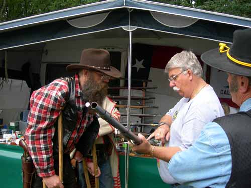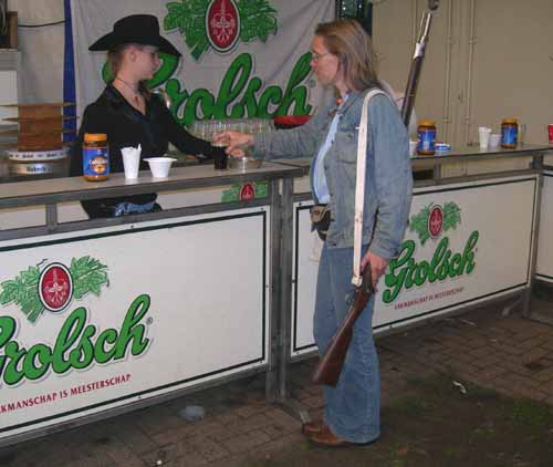 Hier Hildo in gesprek met Leo Hemelrijk, de zwartkruit specialist van Nederland. Leo heeft Hildo's musket Betty in handen en doet alles uit de doeken over vuurstenen, het harden van het aambeeld met hardingspoeder en het opkalefateren van de loop aan de binnenzijde. Hildo houdt zijn oren wagenwijd open want deze rasechte Amsterdammer heeft niet alleen een antwoord op Hildo's vragen, maar blijft ook ongevraagd andere ter zaken doende informatie spuien. Een bijzonder aardige man die volgens Hildo in hart en nieren zwartkruit liefhebber is. Voor de musket 10 nieuwe vuurstenen, een geweldig mooie poetsstok en een speciaal lampje om in de loop te kunnen kijken voor wanneer Hildo probeert om de binnenzijde van de hobbelige loop in betere staat te krijgen. Voor de Dragoon wat percussiekapjes en een halve kilo Pow-Ex FFFG kruit... misschien schiet het wel beter. Ook nog een koperen kruitflesje om zonder kruitmolen de kruitbuisjes te kunnen vullen, zoals bijvoorbeeld op een westernweekend. Ditmaal had Hildo zijn reguliere kruitmolen bij zich maar die is daar minder geschikt voor, het is toch wat delicater en gesneuveld voor je het weet. Een speciaal (kruit) flesje voor het toedienen van pankruit voor de musket had Leo niet bij zich maar die kan per post.