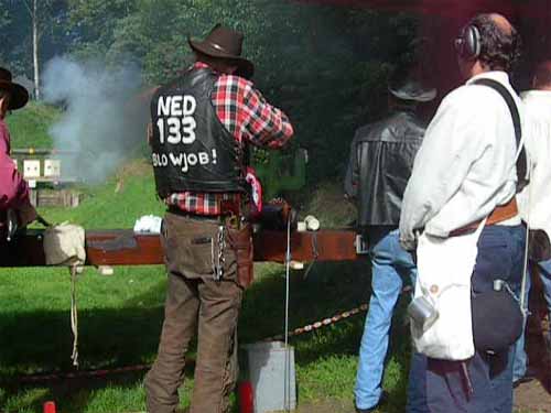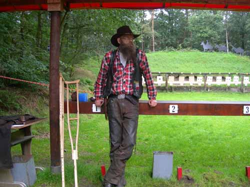 Op de schietbaan en Hildo is er klaar voor. Een passend holster kreeg hij trouwens zomaar voor niks van zijn instructeur. 'Heb hem ook gekregen dus ik hoef er niets voor te hebben'. Nou, dat is helemaal super natuurlijk! Bovendien: de hele dag met de Colt Dragoon in je broeksband, de loop richting edele delen, te moeten lopen is ook niet alles. De revolver weegt er wel in en Hildo heeft het hele weekend het gevoel gehad of een onzichtbaar persoon zijn toch al niet zo goed zittende pantalon naar beneden probeerde te trekken. Hildo heeft een paar broekophouders nodig! U vraagt zich af waarom Hildo op een paar ouderwetse krukken rond strompelt? Sommige mensen dachten dat het bij zijn 'act' hoorde, maar zo was het niet. Het komt omdat Hildo een week of drie terug, tijdens zijn vakantie, ergens in Litouwen met de Harley van de trap van een hotel gevallen is toen hij naar binnen probeerde te rijden. De krukken zijn originele Litouwse exemplaren, maar dat is een ander verhaal.