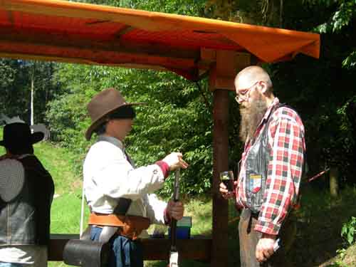 Duel schieten! De mannen staan naast elkaar en wachten tot een lampje van rood op groen springt. Dan is het zaak zo snel mogelijk de revolver te trekken en een ballonnetje stuk te schieten met een vilten propje. De tijd wordt elektronisch geregistreerd. Het lijkt leuk, maar dit is helemaal niets voor Hildo. Een man van Hildo's leeftijd stond er bij te trillen als een alcoholist die een week geen drank gehad heeft. De adrenaline giert je natuurlijk door het lijf. De trillende man bleek overigens na afloop wel de snelste schutter van het evenement. Hildo doet het liever wat rustiger aan en spaart zijn zenuwen.