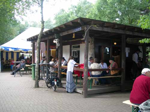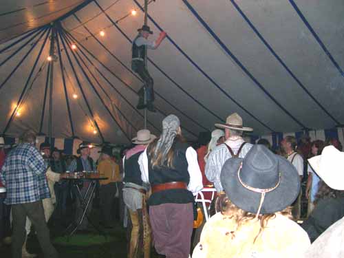 Zaterdagavond en in de feesttent is het tijd voor een biertje. Een prima bandje, The Cowpokes voor de geïnteresseerden, hield de stemming erin. Een trio met gitaar, mandoline en zelfs een man die uitstekend met een banjo overweg kon. Een foto van de band is tot Hildo's grote spijt mislukt. Waar overdag tot de tanden gewapende cowboys rondwandelen mag er na 8 uur 's avonds niets meer gedragen worden. Geen schiet-, steek- of slagwapens en iedereen houdt zich er als vanzelfsprekend aan.