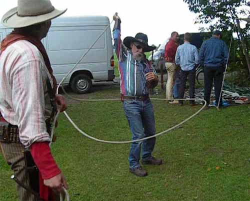 Vrijdag 18-20 augustus 2006. Westernweekend Davy Crockett Het is vroeg in de ochtend van vrijdag 18 augustus. Gisteren, donderdagavond laat, zijn Hildo en Aaltje aangekomen. Hildo snel in het donker het tentje opgezet en Aaltje de luchtbedden opgepompt. 'Een beetje comfort is toch wel lekker als je wat ouder wordt' grapt Hildo. Het was zelfs op donderdagavond al erg vol op het grasveldje maar gelukkig had Hildo's instructeur van Hildo's eigen club SV Cassidy nog een plekje vrijgehouden. Da's aardig natuurlijk. Hildo is erg benieuwd hoe het toegaat op een westernweekend dus snel slapen, dan is het eerder ochtend.