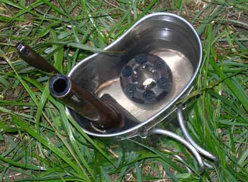 De loop van de musket is eenvoudig te reinigen. Men neme een mestin stampvol heet water, gooit anti-roos shampoo (Hildo had geen afwasmiddel) in de loop en zet de gedemonteerde loop met de achterzijde in de mestin. Wel ervoor zorgen dat het zundgat onder water zit. Dan de loop doorhalen, en wat gaat dit mooi met de nieuwe pompstok! Heet water wordt het zundgat ingezogen en er vervolgens weer uitgepompt. Lekker door blijven soppen. Daarna nieuwe mestin op het vuur en alles nogmaals. Daarna zundgat dichthouden en de loop vervolgens een paar keer volgieten met heet water om hem dan weer leeg te gieten. Daarna de brandschone maar ietwat vochtige loop snel behandelen met wapen olie. Dan het vuursteenslot nog eenzelfde soort behandeling. De revolver en de musket goed schoonmaken? U bent twee uur kwijt. Echt waar! Van een passerende zwartkruit schutter kreeg Hildo het advies koelvloeistof te gebruiken in plaats van water. Koelvloeistof beschermt ook metaal aan de binnenzijde van een automotor d.m.v. een antiroest middel wat er standaard in zit. Hmmm, denkt Hildo, daar zit wat in. Volgende keer soppen in de radiateur van de auto? | |