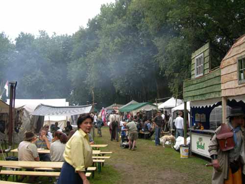 Het terrein met tenten van handelaren. Soms echt leuke dingetjes bij, maar ook Hildo's budget is beperkt. Van de 250 euro die hij meegenomen had naar het westernweekend was aan het eind niets meer over. Schietbeurten, eten, wat zwartkruit spulletjes en het is op voor u het weet.