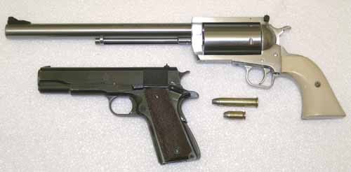 Norinco 1911 vs Magnum Research BFR Niet dat het plaatje iets toevoegt of anderszins zinvol is, maar altijd leuk om het een en ander in verhouding te zien. De 1911 is toch echt een full size pistool, maar moet het overduidelijk in lengte èn slagkracht afleggen tegen Hildo's polsverstuikende Magnum Research BFR revolver in 45-70. Hildo denkt nu al dat hij de 1911 in de praktijk misschien niet zo'n leuke metgezel zal vinden, maar wel een praktischer en handzamere, zeker met licht geladen munitie.