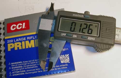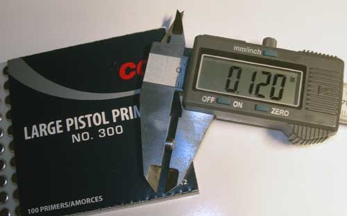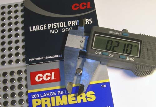 Large Pistol vs Large Rifle primers U weet het vast wel, maar Hildo niet: Wat is nu het verschil tussen de CCI nr. 200 large rifle en de CCI nr. 300 large pistol primers? Op het oog zien de slaghoedjes er identiek uit, maar de schuifmaat laat het zien. De large rifle is met 0,126" hoger dan de large pistol die maar 0,120" meet. Beide slaghoedjes hebben dezelfde 0,210" diameter. Als u ze door elkaar laat vallen, wordt het in ieder geval een sorteerklusje. Hildo heeft CCI slaghoedjes, ze doen het prima en zijn naar verluidt iets harder dan bijvoorbeeld Federal en dat helpt tegen ongewenst afgaan tijdens het primen van de huls. Toch is het altijd aan te raden om tijdens herlaadwerkzaamheden een (veiligheids) bril te dragen. Hildo heeft er altijd eentje op, dus met zijn oogbescherming zit het wel goed.