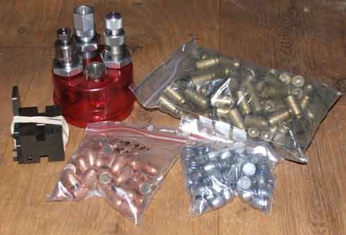 Herlaadspullen, zomaar gekregen! Hildo's zwartkruitbroeders hebben nog het een en ander liggen op nitrogebied. Loden Cees vertelt dat hij nog een 45 ACP 3-die set heeft, ooit zelf een keertje gekregen en misschien nog een passend gietblok. Helaas, het gietblok blijk te klein van diameter. Maar de LEE 3-die set is prima en blijkt zelfs een carbide uitvoering, van knetterhard materiaal en dat betekent dat de hulzen niet gevet hoeven te worden. Erg mooi, want het scheelt geklieder. Van Peter, die zelf een Colt 1911 heeft, krijgt hij een dikke 100 gebruikte hulzen, wat gekochte gegoten 185 grain rondneus kogels en een zakje 230 grain volmantelkogels. Zijn die mensen aardig of wat? Slaghoedjes heeft Hildo net gekocht, hij is er dus helemaal klaar voor!