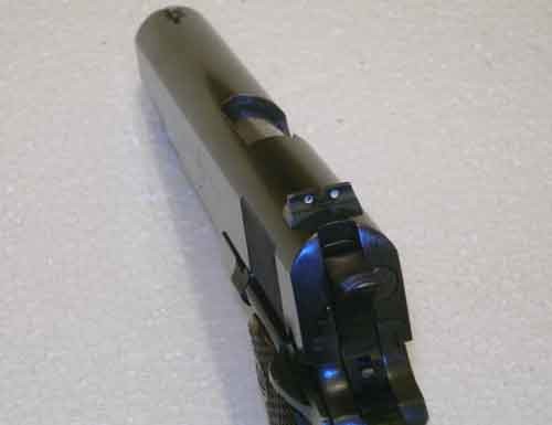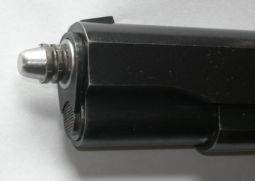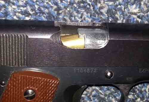 De patronen Wat een bolle dikkerdjes, hè? Bovenaan ziet u de RCBS semi wadcutter kogels. Op de onderste foto ziet u de 230 grain FMJ kogel. De uitstekende hulsrand lijkt een vloeiende aanvoer van de wadcutter patronen te bemoeilijken. De verkoperde rondneus kogels glijden als boter de loop in.