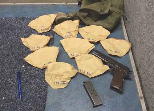 15 januari 2014. Twee in de tien! Hildo had nog dik 70 patronen liggen met de met gewoon daklood gegoten RCBS 452-185 semi wadcutter. Omdat die kogels de loop met lood versmeren, heeft hij ze maar even allemaal achter elkaar er door gejast, heeft hij dat ook weer gehad. En hoe ziet de loop er naderhand uit? Het lijkt mee te vallen, net of de kogels een gedeelte van de loodafzettingen van de vorige serie uit de loop schrapen. Wel is duidelijk te zien dat ditmaal de loodversmering over de volledige looplengte gaat, waarbij het lood zich in een hoek van de trekken afzet. Gevalletje van gascutting lijkt het, of het lood wordt langzaam door de loop naar voren geduwd tijdens het schieten. Toch blijven de kogels mooi gestabiliseerd vliegen en is er van sleutelgaten geen spoor te bekennen. Slechts tweemaal weigert het wapen tijdens de toevoer van de patroon naar de kamer, valt erg mee gezien het gebruik van de semi wadcutters. De Precisie? De keep heeft Hildo nu in het midden gezet, maar er lijkt nog steeds een lichte afwijking naar rechts te bestaan, misschien toeval. Daarnaast is er ook een duidelijk zichtbare groepvorming van links onder naar rechts boven. Dit zal veroorzaakt worden door de zware trekkerdruk. De precisie kan beter, geeft Hildo toe, maar het tempo ligt hoog: beide magazijnen vol drukken en knallen en weer opnieuw de magazijnen voldrukken, etc., etc. De magazijnen vullen is zelfs een storende factor: lekker doorknallen is leuker. Maar of de grote groep uiteindelijk aan het pistool ligt of aan de schutter, daar is Hildo nog niet helemaal over uit. Hij weet wel dat hij met zijn zwartkruit Walker revolver een betere score neer weet te zetten dan met de Norinco. Maar het tempo waarin de 1911 de kogels eruit weet te spugen, kan de Walker echt niet bijhouden. Zware trekker Iets wat Hildo steeds vervelender begint te vinden, is de hoge trekkerdruk. Die is dusdanig hoog dat hij echt kracht moet zetten voor het schot valt, echt sjorren aan de trekker. Met het vingertopje de trekker overhalen gaat te zwaar. Een dergelijk hoge trekkerdruk is niet goed om topscores neer te zetten. Hoe anders gaat dat met de Walker: zijdezacht, vederlicht en zonder gesleep of gekraak van de trekker valt de hamer en vliegt de kogel, bijna loepzuiver, naar het doel. Kan Hildo een pistool tunen? 'Tuurlijk kan ik dat, hoe moeilijk kan het zijn?', aldus Hildo. Of Hildo daadwerkelijk de trekker goed voor elkaar krijgt of aan ernstige zelfoverschatting lijdt en het pistool na de behandeling zo de prullenbak in kan, zal later blijken.