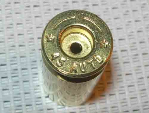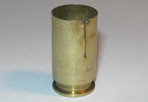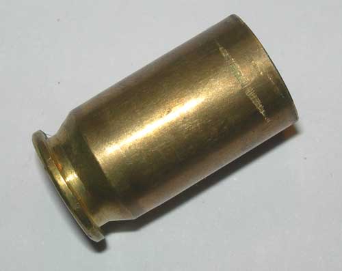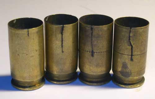 27 november 2013. Gescheurde hulzen De linker is van de 185 grain RCBS wadcutter met 3,2 grain BA10, in de drie hulzen aan de rechterkant zaten de 230 grain volmantels, eveneens met 3,2 grain BA10, volledig geladen volgens het herlaadboekje met de juiste COL (Cartridge Overall Length). Er is geen sprake van overdrukverschijnselen aan het slaghoedje. Misschien wat oudere hulzen. Hulzen hebben bij een pistool, in ieder geval bij deze Norinco 1911, stukken meer te lijden dan bij een revolver.